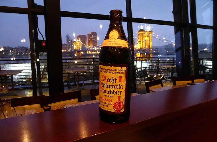 Aber der Reihe nach, nachdem der Bamberger Autor tief schürfte, um die gemeinsame Geschichte der beiden Städte jenseits und diesseits des großen Teichs aufzuarbeiten. Angefangen bei der "Hauptsehenswürdigkeit von Cincinnati am Ohio River: der ,Suspension Bridge'". Zumal sich an diesem Gegenstück zur historischen Kettenbrücke das Panorama-Restaurant "Moerlein Lager House" befindet, das "Aecht Schlenkerla Rauchbier" bietet.