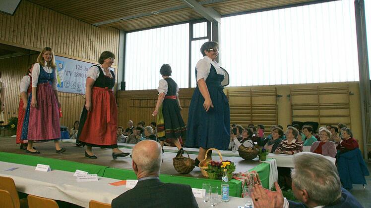 Dann kam endlich die von allen längst und sehnlichst erwartete Modenschau der Landfrauen. Eingeleitet wurde sie vom den BBV-Chor. Singend und geschürzt und mit allerlei Kochlöffeln, Besen und anderen Instrumenten gewappnet zogen sie in den Saal ein. Nach den Liedern: "Was wären die Männer ohne uns" und "Das bisschen Haushalt" tobte bereits der Saal. Unter dem Thema: "Plaudereien aus der Schürzentasche" präsentierten in schneller Folge einige Dutzend Landfrauen auf dem großen Laufsteg die Schürzenmode aus vielen Jahren und Arbeitsbereichen. Dazwischen durften sich auch einige Männer präsentieren. Besonders herzlich aber zeigten sich die Kinder bei ihren Vorführungen. Gezeigt wurde, dass bei der Arbeit, bei Festen wie Hochzeiten, aber auch Beerdigungen jeweils andere Schürzen getragen wurden. Der Stil und Schnitt unterschied sich auch bei Stellung bei einem Bauern von der in einem städtischen Haushalt oder in höheren Diensten.