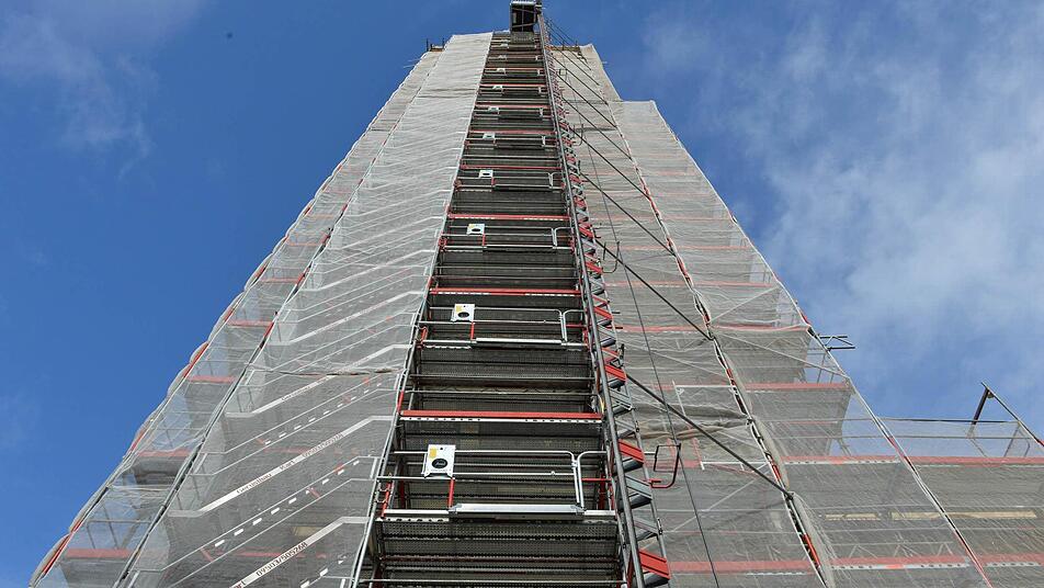 60 Meter. Der Kirchturm der "Oberen Pfarre" am Kaulberg ist so hoch, dass er extra für die Bauphase einen Aufzug bekommen hat. Genauer gesagt, das Gerüst, das sich am Turm wie ein Außenskelett fest klammert.