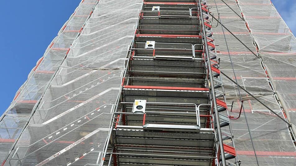 Ungefähr bei Höhenmeter 50 schlägt einem der Wind ins Gesicht, zerzaust das Haar, fährt in die weißen Planen am Gerüst. Ursula Huber, Leitende Architektin auf der Baustelle, deutet auf ein Fenster am Kirchturm: Der Stein ist mit einer weißen Schicht überzogen - Vogelkot. "Wir haben hier einen Wanderfalken. Aus Naturschutz-Gründen haben wir mit dem Einrüsten des Turms gewartet, bis die Jungen flügge waren." Das war im Sommer 2013, dann kamen sofort die Gerüstbauer.