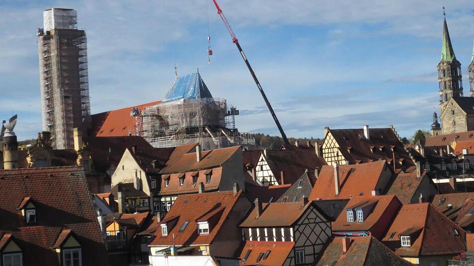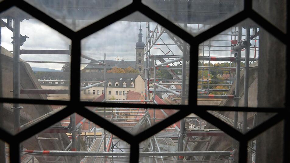 Apropos sehen: Vom 60 Meter hohen Kirchturm sieht man direkt hinunter auf den eingerüsteten Chor - von der einen Baustelle die andere sozusagen. Aber hier oben geht der Blick eher gen Himmel, hinweg über Bambergs Dächer.