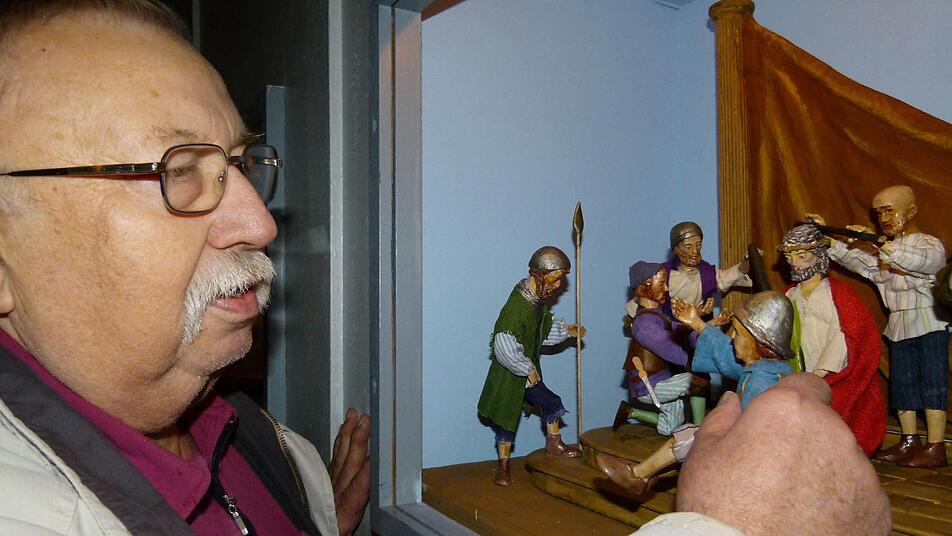 Blut - wenn auch gemaltes - fließt. Todesangst wird spürbar, Entsetzen, Trauer. Passionskrippen folgen ihren eigenen Gesetzmäßigkeiten, künden vom Leiden und Sterben Jesu: "so, wie es das Evangelium hergibt", fasst Wilfried Kuntke zusammen. Als stellvertretender Vorsitzende der Bamberger Krippenfreunde hat er diese 26. Schau des Vereins organisiert und mit einigen Helfern arrangiert. ""Ich sage lieber Fasten- statt Passionskrippen", erklärt Kuntke und zeigt gleich etliche Exemplare, die biblische Szenen außerhalb der Leidensgeschichte wiedergeben: Jesus mit der Frau am Jakobsbrunnen etwa, die Auferweckung des Lazarus, Jesus predigt im Tempel oder Jesus heilt einen Lahmen.