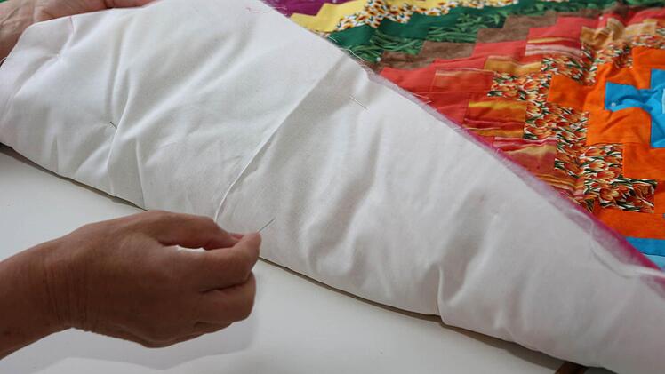 Arbeit mit Überraschungseffekt Nachdem die Anordnung der Einzelteile vollendet ist, wird dann die passende Mittelschicht aus Vlies oder Baumwolle befestigt, auf der Rückseite bildet eine weitere Stoffbahn die dritte Lage.
