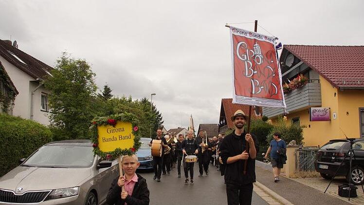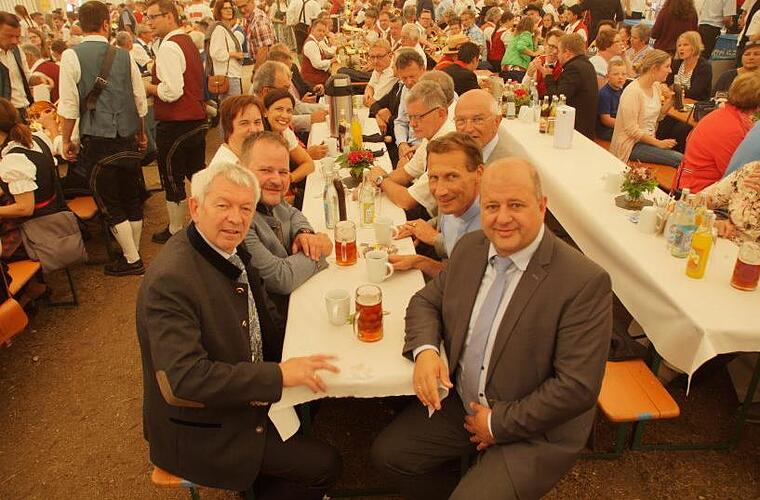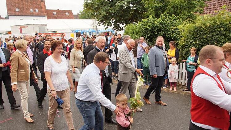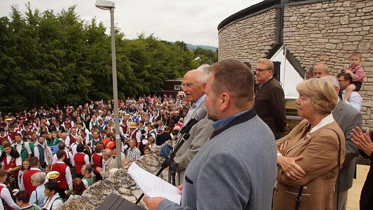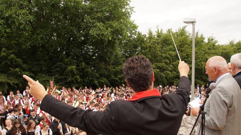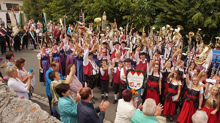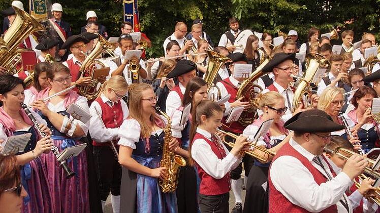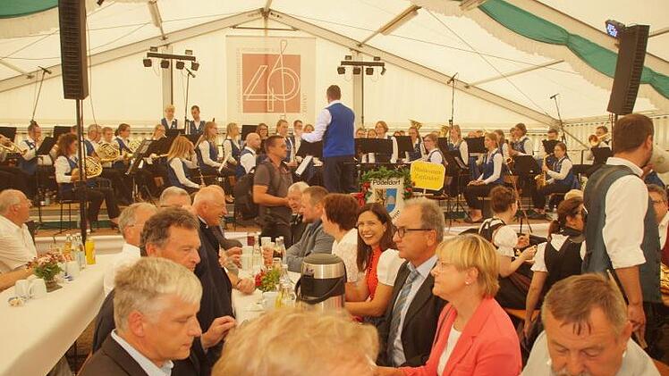 Nach dem Umzug begrüßte Sebastian Weber auch im Namen der übrigen Vereinsleitungsmitglieder Peter Schott, Stephan Wolf und Maria Günthner die vielen Musikerkollegen und -freunde. Besonders dankte er Herbert Lorenz, dem Gründer der Blaskapelle, der es damals schaffte, innerhalb kurzer Zeit ein leistungsfähiges Orchester auf die Beine zu stellen. Es folgte das Gemeinschaftsstück "Apertum".
