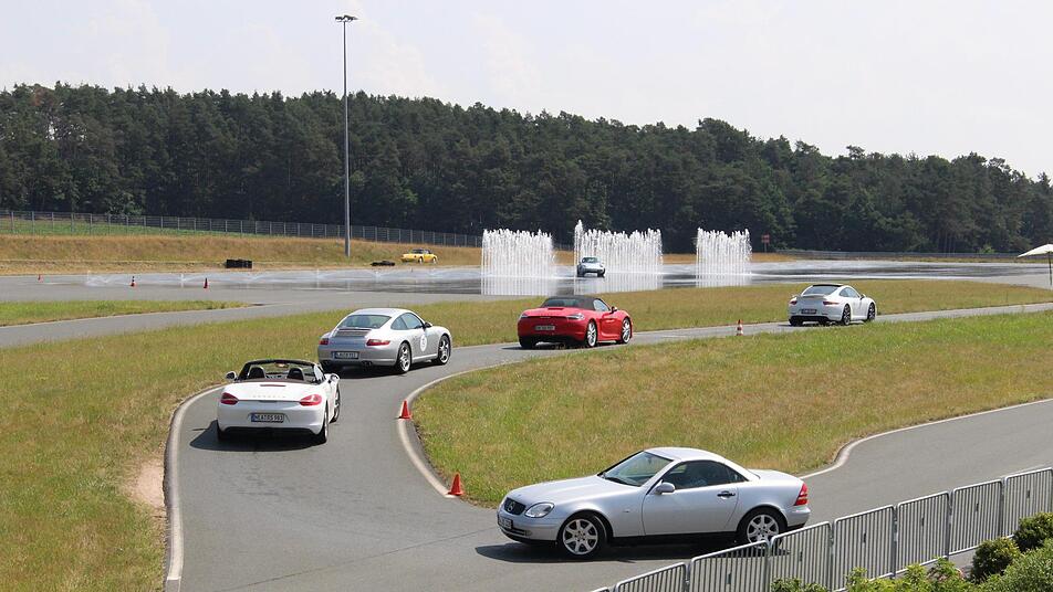 Nein, Regen oder Gewitter gab es am Samstag im Steigerwald nicht. Für den nassen Belag der Fahrbahn wurden die eigens eingebauten Fontänen geschaltet. Wie sich ein Überschlag anfühlt, konnte im Simulator des ADAC ebenfalls erprobt werden. Künftige Porsche-Fahrer übten im Race Truck die besonderen Eigenschaften eines sportlichen Fahrzeugtyps.