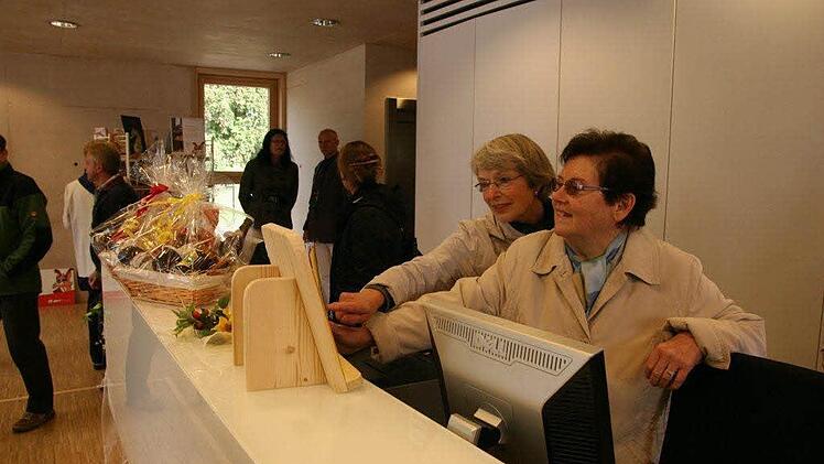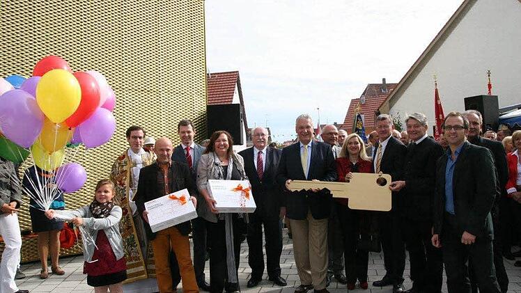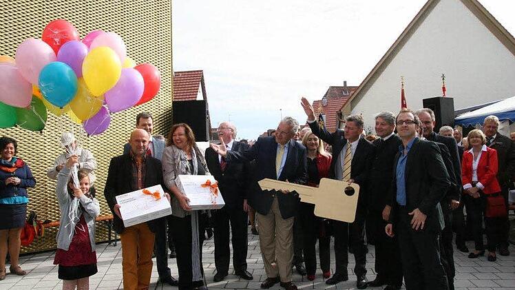 Natürlich war auch der Schlüssel gülden, den Stephan Häublein von den H2M-Architekten symbolisch dem Bürgermeister übergab. Doch damit nicht genug: Als Zeichen der Verbundenheit schenkte Häublein dem Büchereiteam ein Laptop zur Arbeitserleichterung. Und dann endlich kam der Ochse an die Reihe und durfte die Bevölkerung durfte die neuen Einrichtungen kennenlernen.