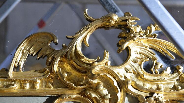 befasst, die auf einem Gerüst am Rahmen eines Wandspiegels arbeitet, ohne sich von der Führung durch die Räume beirren zu lassen: ehemals königliche Zimmer, in denen diverse Teile der Rokokoaustattung wie die Wandspiegel - und Pfeilerspiegel der Vertäfelung ebenso wie die Stukkaturen einer Ofennische in die Neugestaltung für das griechische Herrscherpaar übernommen wurden und lediglich im Stil der Zeit neu gestrichen wurden.