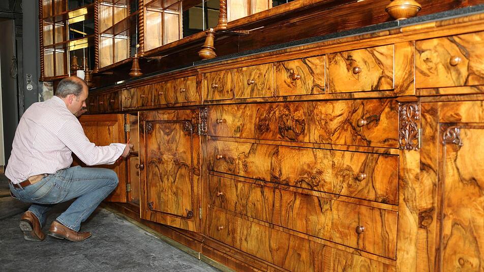 Restaurator Paul Ankebrand hat den Schrank aus Nußbaumfurnier in weit über 1000 Arbeitsstunden hergerichtet. Mit einem Kollegen hat er sich etwa fünf Monate um das imposante Möbelstück gekümmert, Verzierungen nachgeschnitzt, die Fronten mit Schellack poliert.