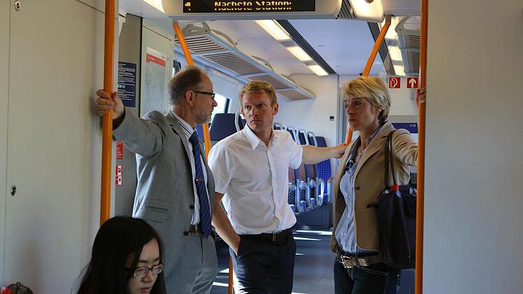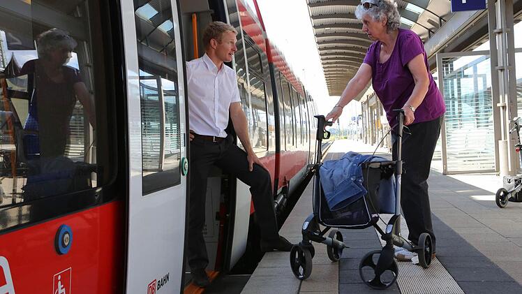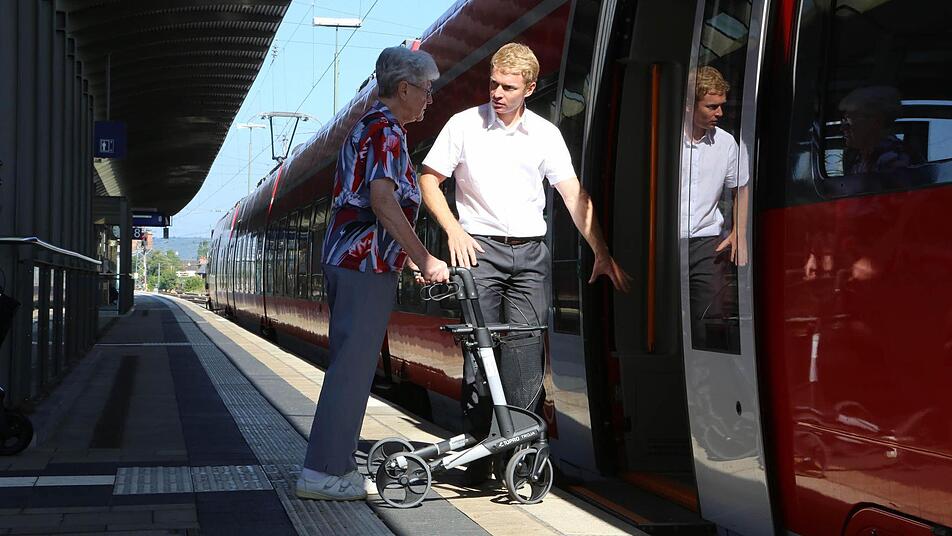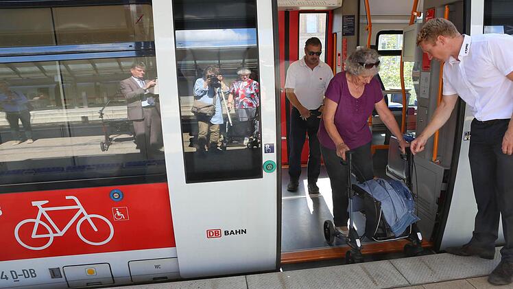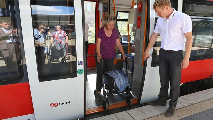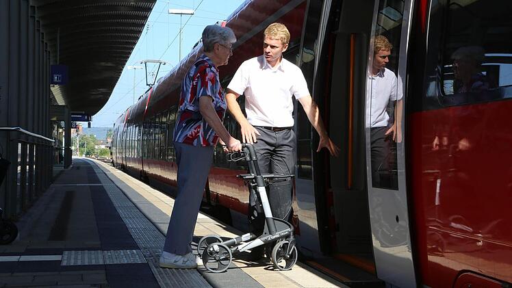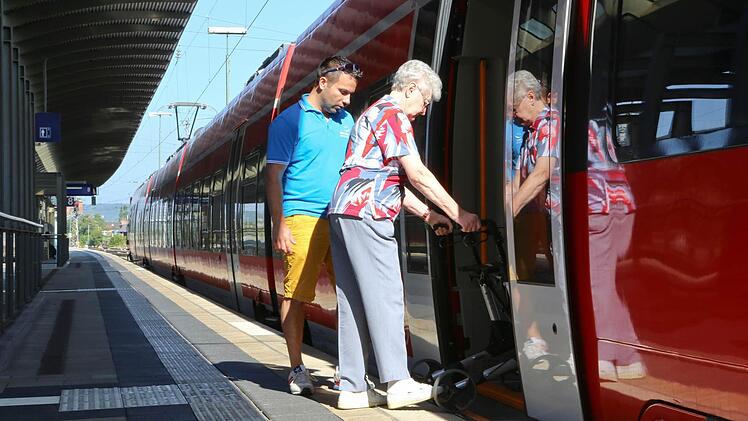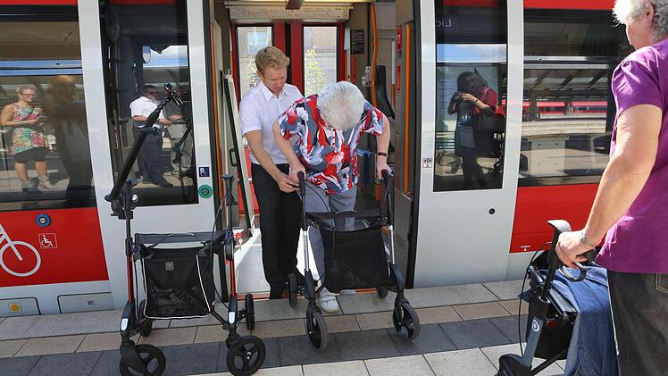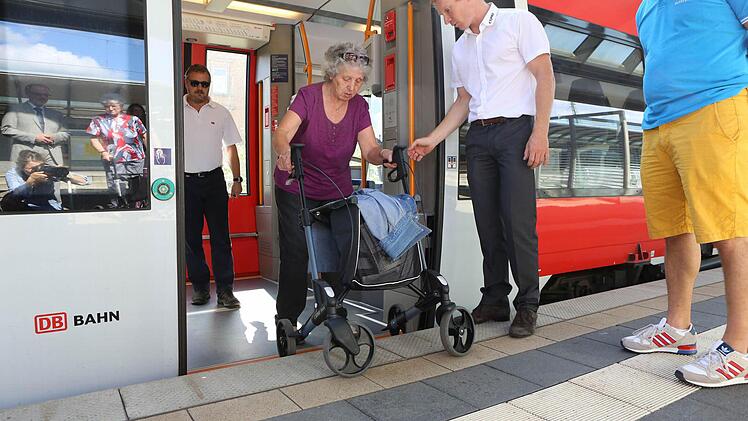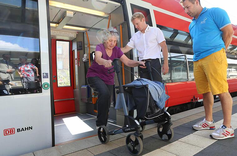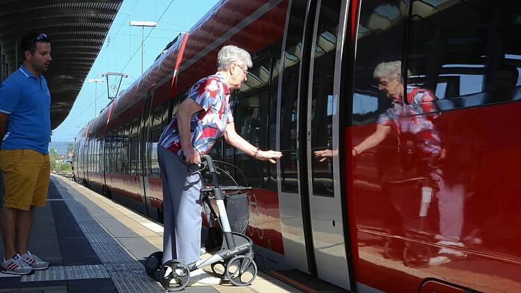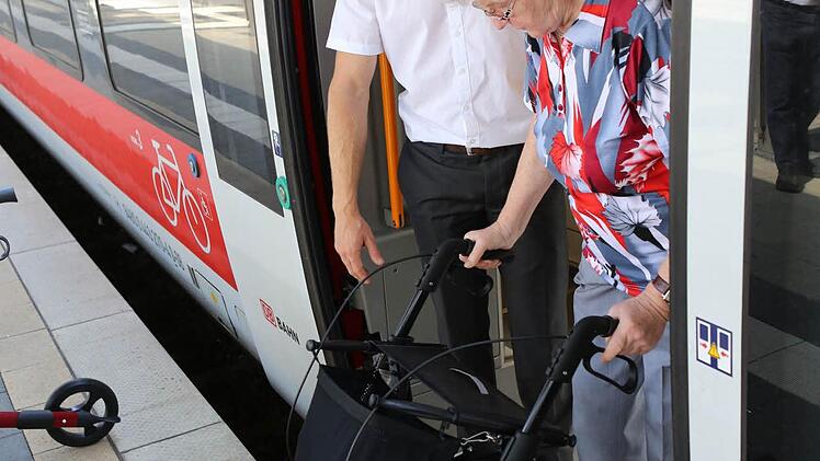 So wie die beiden Damen, die an der Endstation Lichtenfels das Ein- und Aussteigen mit dem Rollator üben. Raus aus dem Zug, das funktioniert gut. Aber rein? Schließt die Tür oder Rampe ebenerdig mit dem Bahnsteig ab, gibt es kaum Probleme. Aber in Lichtenfels müssen die beiden Bamberger Seniorinnen eine Stufe überwinden.