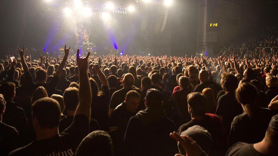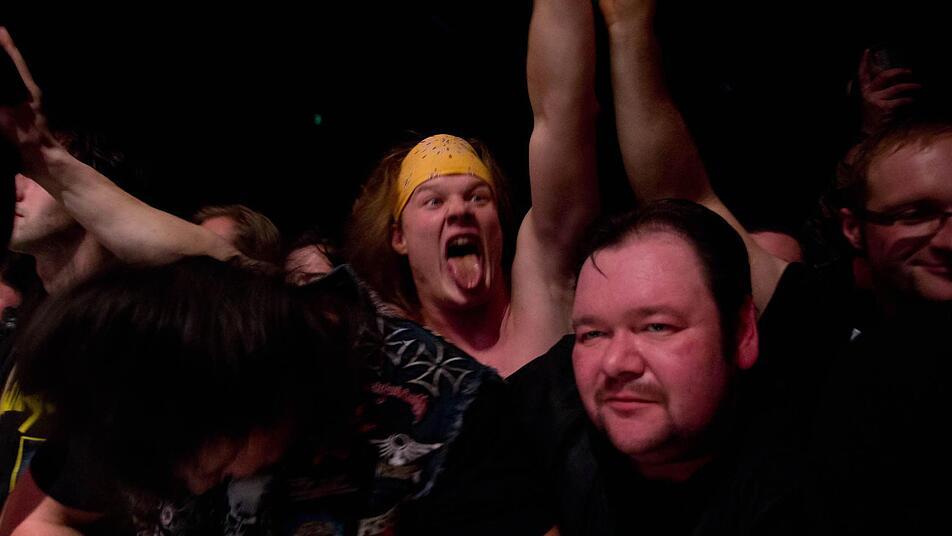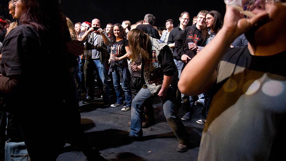 Während man noch über die Semiotik des Satansgrußes mit zwei Fingern grübelt, drängt sich ein martialisch aussehender Geselle mit der Beschriftung "Mee Büffel Franken" vorbei. Ganz höflich, wie es sich bei den Metal-Fans überhaupt um honorige Leute handelt, die sich schneller entschuldigen als das aus dem Konzertsaal drängende Symphoniker-Publikum.