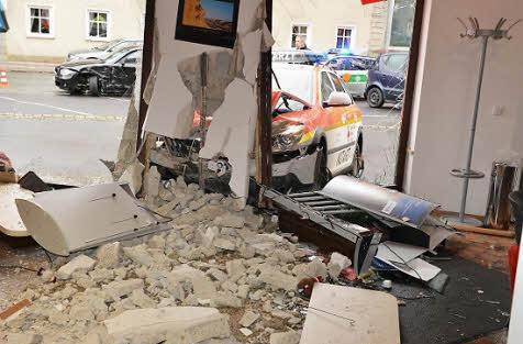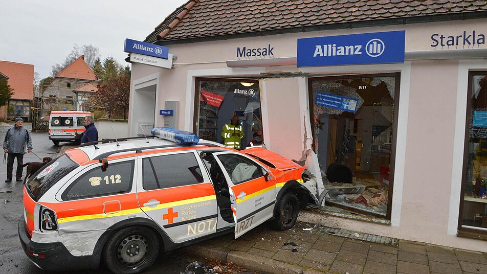 Gewaltig war der Knall, der Herbert Massak Dienstagmorgen zusammenzucken ließ: Ein Einsatzfahrzeug des BRK war mit voller Wucht in das Schaufenster seiner Geschäftsräume gedonnert - als Massak hinten im Büro stand.