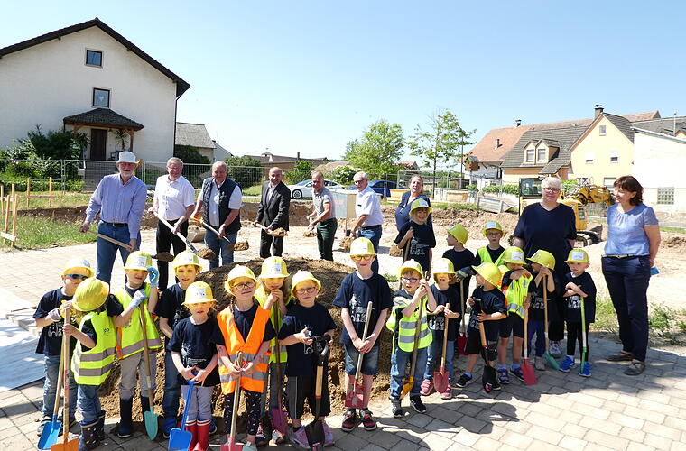 Ebenso freuten sich drei Erzieherinnen und Kinderpflegerinnen und ihre 18 Schützlinge des Kindergarten Sonnenschein über den Beginn des Neubaus. Die Kinder hatten eigens für dieses freudige Ereignis ein Gedicht und ein Lied gelernt und trugen diese vor. Danach sprach Bürgermeister Krapp noch einige Worte zur Entwicklung und die Notwendigkeit dieses Projektes. Geplant ist der Bezug des Kindergartens für September 2024.