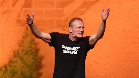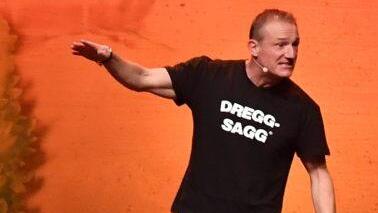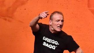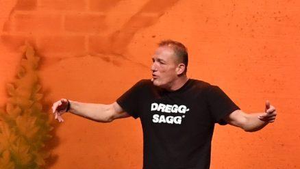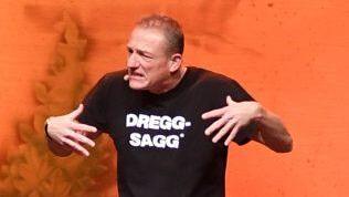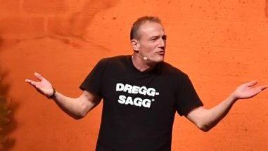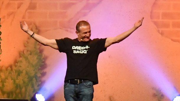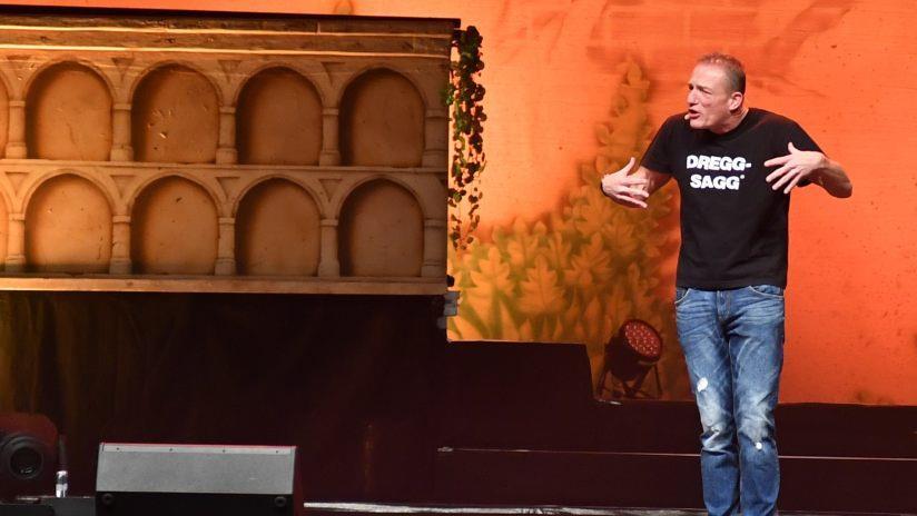 Man kennt das Shirt. "Dreggsagg" steht darauf, ein sogenanntes Markenzeichen. Einige Fans von Michl Müller haben es sich sogar besorgt und angezogen, sich der Selbstbezeichnung anschließend. Es gibt jetzt auch Kühlschrankmagneten und Mützen und Pralinen: Dreggsagg, Dreggsagg, Dreggsagg. Der Künstler verschwindet hinter den Boxen seiner Merchandise-Produkte.