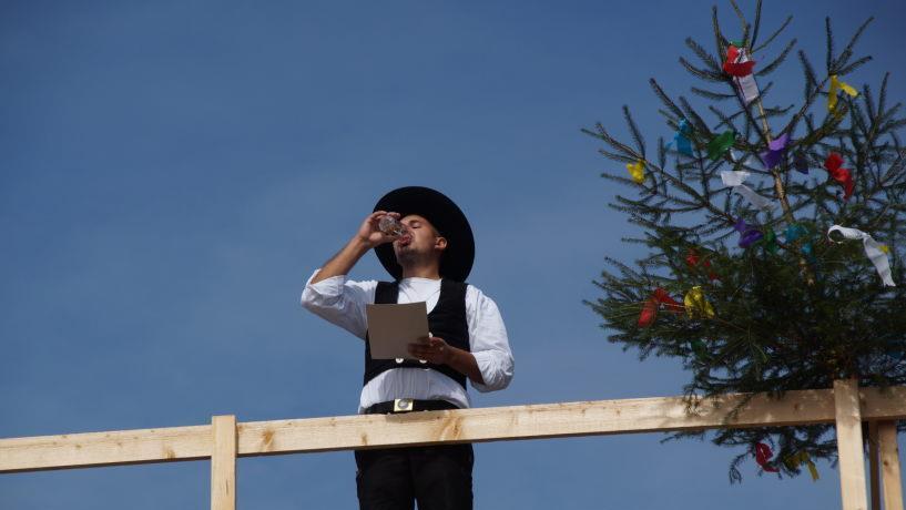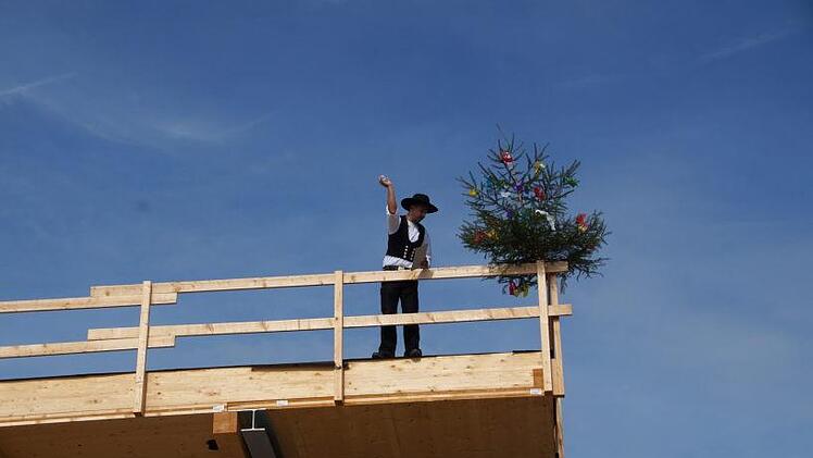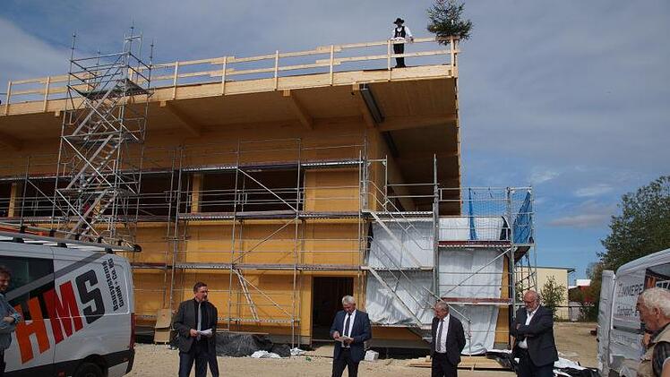 Dann gingen alle Augen nach oben, wo Zimmermeister Marcel Keßler für die Firma Holzbau Müller und Schick aus Schondra in der Rhön den Richtspruch verkündete: "Ein schönes Werk ist uns gelungen; gar stattlich steht das Bauwerk da, so frei und leicht und ungezwungen, wie besser ich es nirgends sah!" Nach dem Lob auf die wackeren Handwerksleute wünschte er: "mit stolz empor gehobenem Blick, dem neuen Bauwerk recht viel Glück." Die drei Gläser Wein gefüllt bis an den Rand gingen nach altem Brauch auf das Wohl der Bauherrschaft, des Architekten und das letzte auf das der Maurer und Zimmerleute. Nach dem Ende seines Richtspruchs warf er mit Schwung das Glas in die Tiefe, denn: "Scherben bedeuten Glück und Segen, der Bauherrschaft auf allen Wegen."