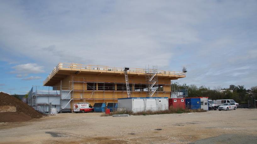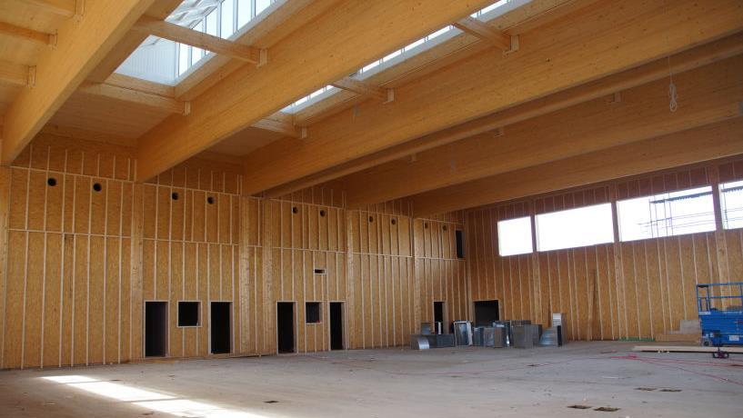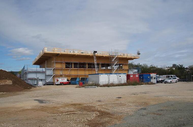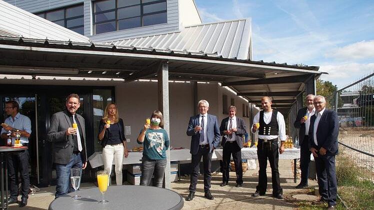 Hoch oben auf dem Gerüst der neuen Zweifachturnhalle samt Mensa flattern die bunten Bänder am Bäumchen, das das Richtfest anzeigt. Dazu strahlt die Sonne pur am wolkenlosen Himmel - ebenso wie es die geladenen Gäste der Feier tun. Es sei alles im Plan, heißt es von allen Seiten als Grund der Freude.
