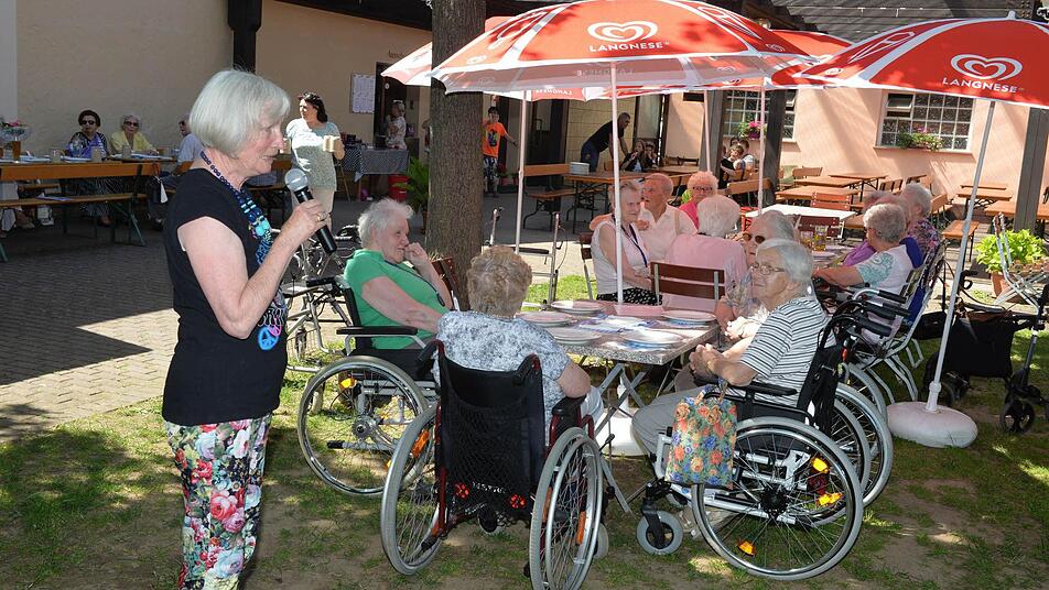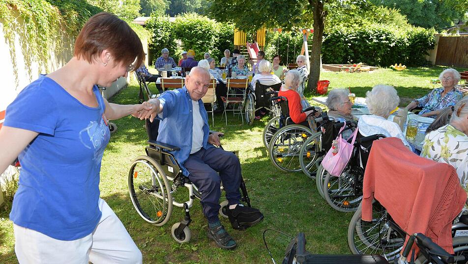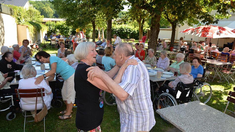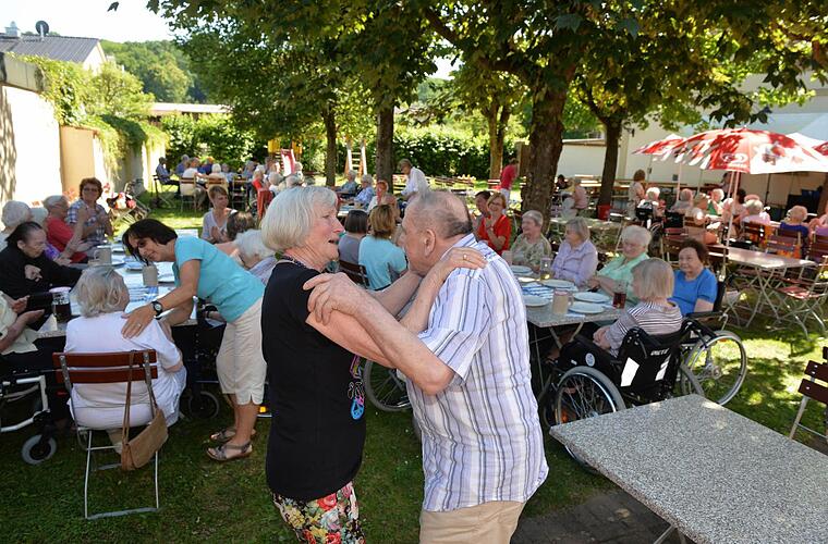 " .... denn heute ist ein schöner Tag, wir feiern alle mit", singt Manfred Wagner: Ja, musiziert, geschunkelt und getanzt wird gerade im Göllerschen Biergarten, in dem sich um die 90 Seniorenheimbewohner treffen. Wenn mancher ältere Mensch, der den Klängen des Stimmungsmachers lauscht, auch nicht mehr so beweglich ist wie in früheren Jahren. So klatschen viele vom Rollstuhl aus im Takt mit, wenn der "Die scho wieder"-Musikant Lieder anstimmt, die vielleicht auch manche Erinnerung heraufbeschwören.