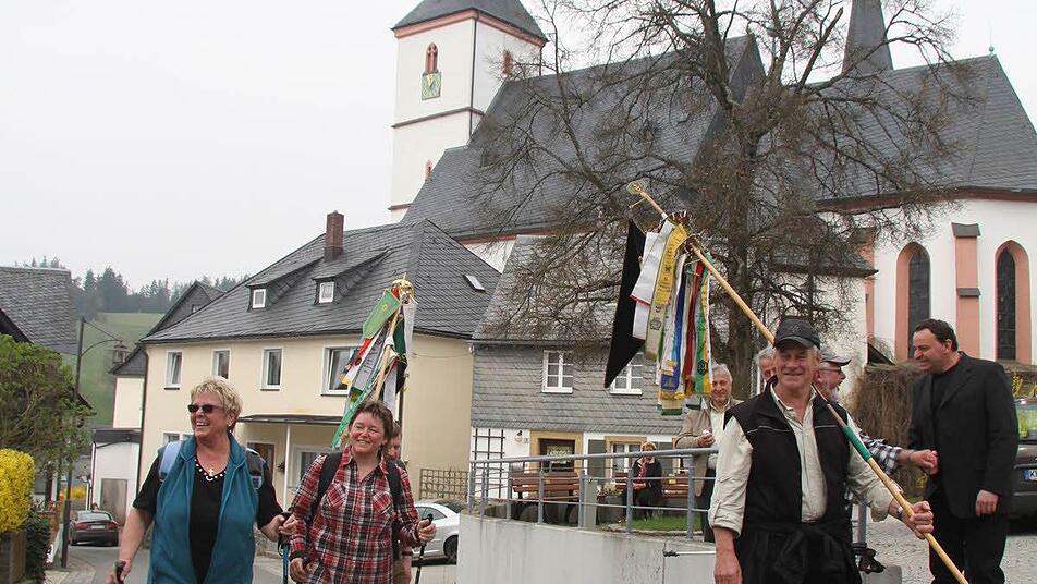 Es ist ein alter Brauch, dass der Wimpel des Frankenwaldvereins nicht gefahren werden darf. Deshalb brachen der Zeyerner Obmann Werner Hempfling, die Fahnenträger Sepp Huber und Rudi Muschick, Claudia Hermann, Sonja Hempfling und Rudolf Hanft schon morgens um 7 Uhr von Zeyern, dem Ort des letzten Frankenwaldtags, auf und wanderten zu Fuß nach Grafengehaig, wo das große Treffen diesmal stattfand. Dass der Weg fast immer bergauf führt, konnte die passionierten Wanderer nicht schrecken. "Das sind zwanzig Kilometer. Wir sind über Geuser, Presseck, Premeusel gelaufen und kamen dann den steilen Berg runter nach Grafengehaig", erzählt Obmann Werner Hempfling. "Am schlimmsten war eigentlich der letzte Berg runter", berichtet Sonja Hempfling.