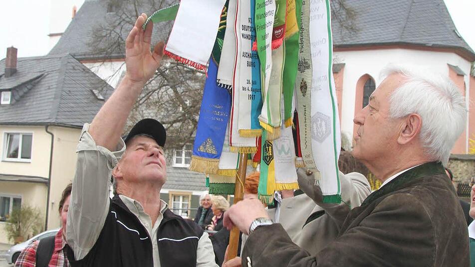 Auf den letzten Kilometern sind noch einige Zeyerner Wanderfreunde dazugestoßen. Und in Grafengehaig hießen die Einheimischen, aber auch Robert Strobel und Karl Schoger vom Hauptverein, die zünftigen Wanderer willkommen. Es gab ein großes Hallo mit Blasmusik, als die Wanderer den Grafengehaiger Berg hinaufschritten. Hauptwanderwart Karl Schoger nahm den Zeyernern "Ballast" ab und trug die Fahne von der Grafengehaiger Kirche bis zur Frankenwaldhalle. Und dort wurde sie dann offiziell der Ortsgruppe Grafengehaig übergeben.