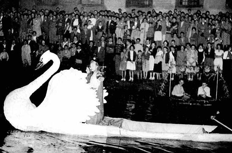 Ja, manches hatten sich die Veranstalter einfallen lassen, um Besucher nicht nur mit Bier und Bratwürsten abzuspeisen. Ein besonderes Highlight war 1955 natürlich der Auftritt "Lohengrins", den ein gigantischer Schwan in einem Kahn zog und auf der Regnitz schaukeln ließ. Wassernixen tanzten, was die romantische Stimmung noch unterstrich. "Ganz im Sinne Franz Albingers wurde der ,Fluss zum Hauptdarsteller und das Festgebiet zur Bühne'", meint Gisela Bosch als heutige Vorsitzende des Bürgervereins 4. Distrikt. Als einer ihrer Vorgänger hatte der Malermeister die Sandkerwa 1951 mitinitiiert, "um dabei auch an das Wasserfest zu erinnern, das es vor dem Zweiten Weltkrieg noch an der Regnitz gab - samt Feuerwerk vor Klein Venedig".