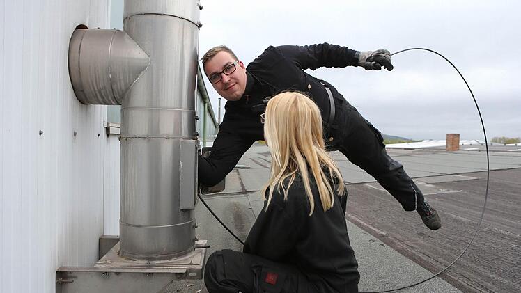 Fünf Stunden früher, um sieben Uhr morgens, stehe ich an meinem Tag als Kaminkehrerin auf Dach Nummer 1. Es ist das Flachdach eines Firmengebäudes im Industriegebiet Trosdorf, hier warten acht Kamine. Patrick Hempel (27) erklärt mir, was ich zu tun habe: Das Türchen am Fuß des Kamins mit dem "Kaminschlüssel" öffnen und dann mit dem "Stoßbesen", eine Art langes Kabel mit Besen in Form einer überdimensionalen Löwenzahnblüte oben dran, in den Kamin schieben (siehe erstes Foto).