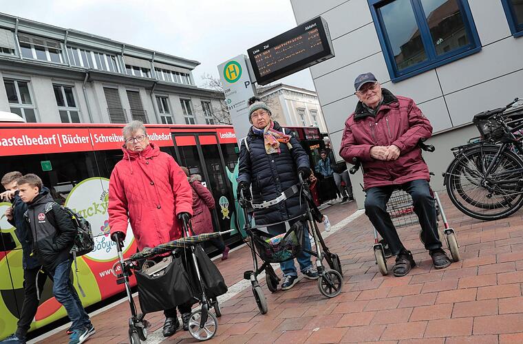 13.30 Uhr am Zentralen Omnibusbahnhof (Zob): Um den Bussteig P tummeln sich Schulranzen tragende Schüler, mit Einkaufstüten beladene Erwachsene und Eltern mit Kinderwägen. Um die Ecke stehen Ilse Hertrich, ihr Mann Fritz und Helga Schmitt mit ihren Rollatoren, alle über 80 Jahre alt und gehbehindert. Hertrich zeigt auf das Gewusel: "Und da sollen wir durch? Unter Zeitdruck?"
