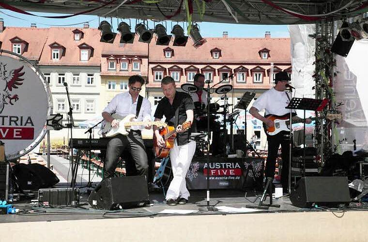 Allen voran gibt "Deutschlands erfolgreichste Austropop-Band" gleich zur Eröffnung den Ton an: "Oben ohne" spielen Austria Five neben anderen Klassikern, um das Publikum auf eine Achterbahnfahrt der Gefühle zu schicken, wie Jo Farmer verspricht. "Wir sind übrigens die erste Band, der Rainhard Fendrich gestattete, ,Oben ohne' zu covern", sagt der Frontmann der Gruppe. Folglich singt Farmer den Bambergern nun bei schweißtreibenden Temperaturen mit seinen Reimen aus der Seele: "Die Hitze der Stadt ist im Sommer brutal, da man fürchterlich matt ist wird das Leben zur Qual." Erinnern Sie sich? Selbstverständlich - wie etliche andere Fans, die bei Konzerten der fränkischen Austropopper mitwippen und mitschnippen, wenn die Band auch an Legenden wie Georg Danzer, Ludwig Hirsch und Falco erinnert: "Künstler, die viel zu früh von uns gingen", meint Farmer.