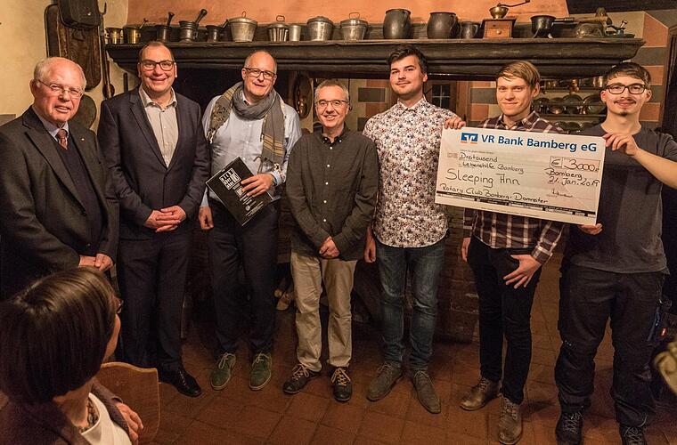 Über einen Scheck des Rotary-Clubs Bamberg-Domreiter in Höhe von 3000 Euro darf sich die Band "Sleeping Ann" freuen.