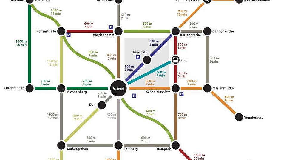 Im Zentrum des Stadtplans, der im Postkartenformat erschien, steht Bambergs ältester Stadtteil. "Einerseits, weil der Sand tatsächlich so etwas wie die Mitte unserer Stadt darstellt. Andererseits,weil die IG interesSand die Aktion sponsert", so Straßenmanager Schäfer. Im Norden zieht sich die Wegstrecke bis Gaustadt, der Ottokirche und dem Bahnhof. Die südlichsten Zielpunkte des Plans sind Wildensorg, die Altenburg, die Würzburger Straße und der Park-&-Ride Platz am Heinrichsdamm.