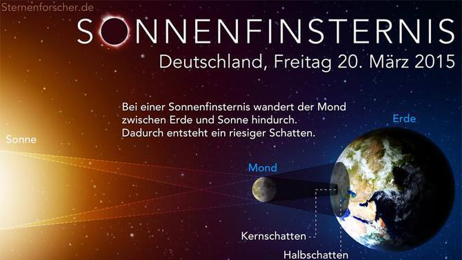 Eine Sonnenfinsternis ist ein astronomisches Ereignis, bei dem die Sonne vom Mond verdeckt wird. Eine Sonnenfinsternis kann nur zu Neumond entstehen, wenn der Mond zwischen Erde und Sonne steht und sich ganz oder teilweise vor die Sonnenscheibe schiebt. Am Vormittag des 20. März schiebt sich der Neumond vor die Sonnenscheibe und verdunkelt sie.