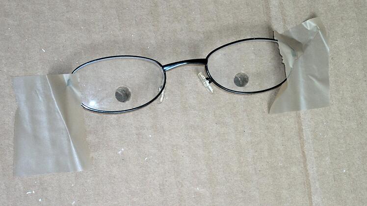 Dann wird die Brille hindurchgesteckt und mit Klebeband möglichst plan zur Kartonoberfläche fixiert.
