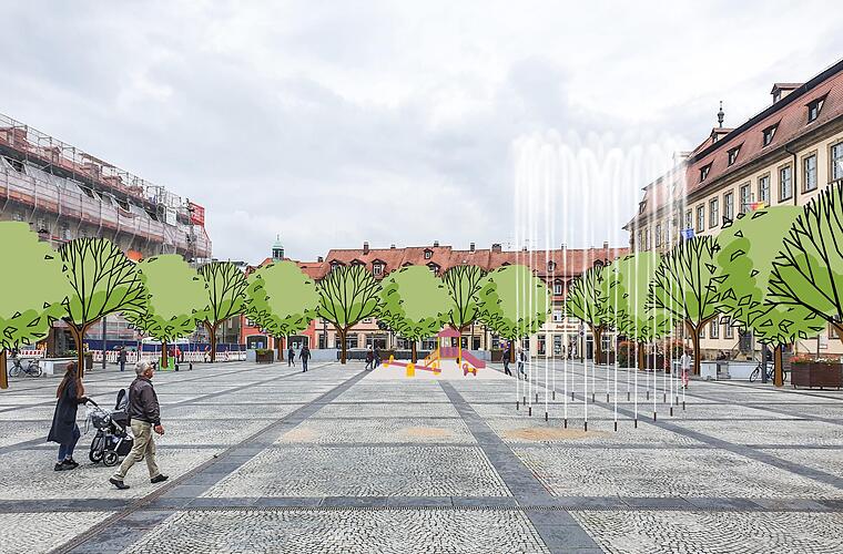 Kinder, die sich mitten auf dem Maxplatz Wasserschlachten zwischen meterhohen Fontänen liefern; Eltern, die daneben auf Holzbänken sitzen und im kühlen Schatten großer Kastanien Eiskaffee schlürfen - so etwas hat der alte Max Joseph noch nie gesehen, wenngleich er schon seit über 130 Jahren auf seinem steinernen Sockel über Bambergs Zentrum thront.