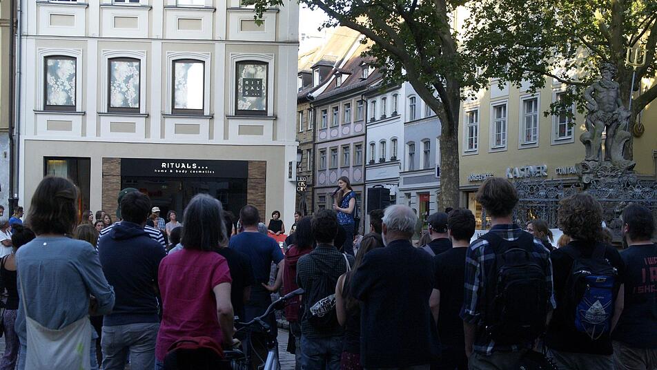 Die Initiativen Freund statt Fremd, das Netzwerk Bildung und Asyl sowie die Interreligiöse Fraueninitiative positionieren sich seit Monaten gegen Abschiebungen ins Krisengebiet Afghanistan. Am Nachmittag veranlassen sie eine spontane Demonstration. Die Nachricht verbreitet sich über Facebook, Whatsapp, E-Mail und Mundpropaganda. Um 20 Uhr versammeln sich tatsächlich rund 300 Bamberger am Gabelmann. Ein Lautsprecher steht bereits, Transparente werden entrollt.