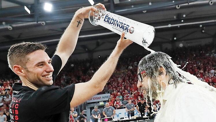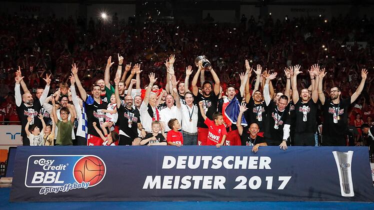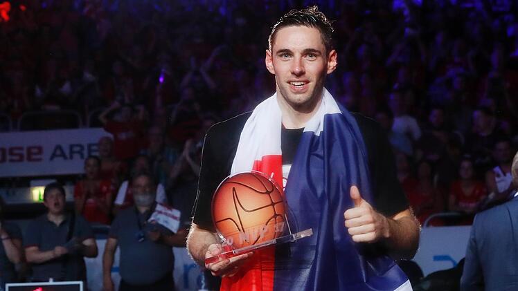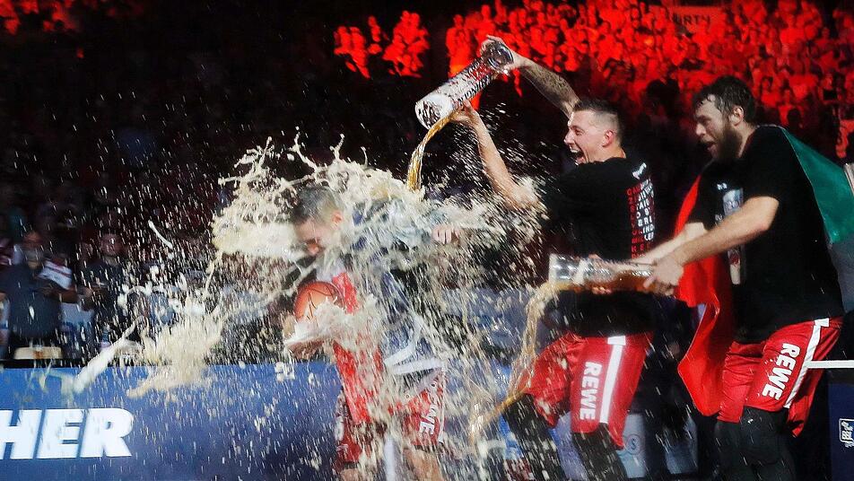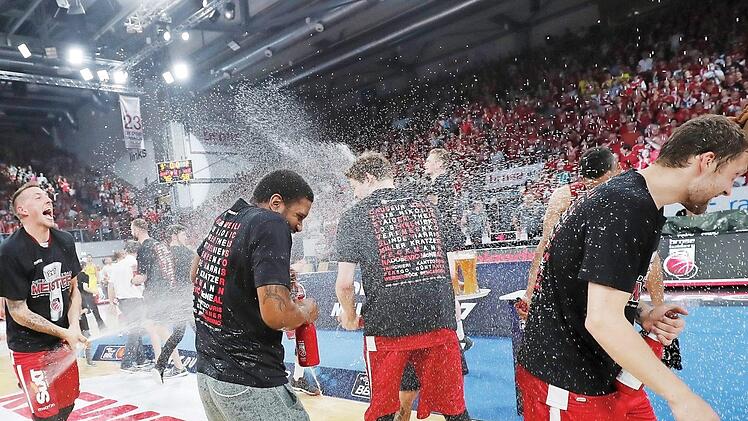 19.12 Uhr: MVP Fabien Causeur, der in den Play-offs die Rolle des Anführers übernommen hatte, nimmt die Trophäe entgegen und wird von Nicolo Melli und Daniel Theis mit viel Weißbier übergossen.