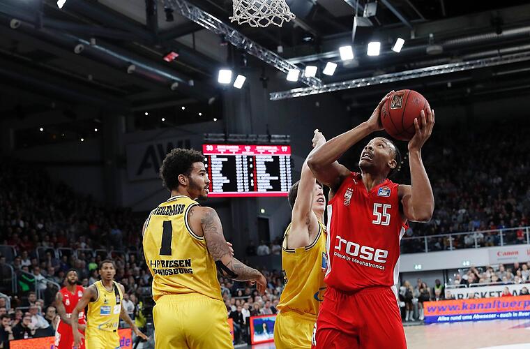 Nach dem ersten 20-Punkte-Vorsprung zu Beginn kam der Brose-Motor kurz ins Stottern, Carrington brachte den Gast auf 33:47 heran. Der zurückgekehrte Olinde mit einem Dreier und einem krachenden Dunking stellte die Verhältnisse schnell wieder klar. Die Ludwigsburger ließen sich aber vom neuerlichen 19-Zähler-Defizit nicht beeindrucken und kämpften sich angeführt vom Ex-Baunacher Marcos Knight wieder heran und lagen vor den letzten zehn Minuten nur noch mit 47:57 hinten.