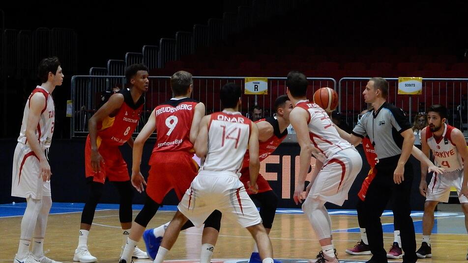 Gegen die athletischen Türken tat sich das deutsche Team schwer, nach zwei Spielen gegen körperlich unterlegene Gegner. Erst nach drei Minuten erlöste Louis Olinde die 1500 Zuschauer in der Messehalle mit dem ersten Korberfolg. Die Türken operierten in der Verteidigung mit einer Zonenpresse und einer Ball-Raum-Abwehr, die den Gastgebern gar nicht schmeckte. Doch Kostja Mushidi brachte glich mit fünf Punkten die Führung der türkischen Talente aus. Die Türkei führte bis kurz vor der ersten Viertelpause. Der Bamberger Nils Haßfurther (Falcons Nürnberg) sorgte für die erste Führung (14:13).
