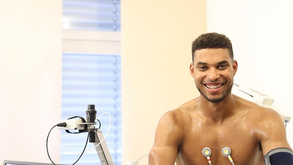 In der letzten halben Stunde kommt Kenneth "Kenny" Ogbe richtig ins Schwitzen. Der unangenehme Teil einer Leistungsdiagnostik für Profisportler steht an: die Spiroergometrie. Der 25-Jährige ist verkabelt, trägt eine Maske. Der Widerstand des Fahrradergometers, auf dem Ogbe sitzt, wird immer größer. Die Belastbarkeit seiner Lunge und seines Herz-Kreislauf-Systems werden überprüft, die Atemgase unter körperlicher Anstrengung gemessen. Schweiß läuft an dem durchtrainierten Oberkörper herab. "Den Teil des Medizinchecks müsste ich nicht unbedingt haben, er ist aber notwendig", sagt Ogbe nach dem Check, bei dem unsere Zeitung exklusiv dabei ist, schmunzelnd. Frisch geduscht wartet er auf die Nachbesprechung mit dem Arzt.