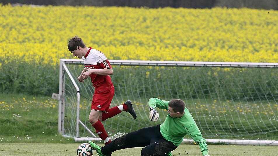 Die Gastgeber starteten druckvoll und versuchten es mit gefährlichen Distanzschüssen. Die größte Möglichkeit vor dem Wechsel hatten allerdings die Reundorfer. Aaron Röckelein kam am "Sechzehner" an den Ball und schoss das Spielgerät aus der Drehung volley auf das gegnerische Tor. Doch der einheimische Keeper Jonas Hollet konnte das Leder mit den Fingerspitzen gerade noch um den Pfosten drehen.