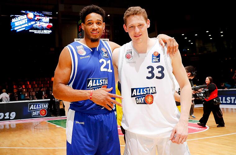 Augustine Rubit und Patrick Heckmann vertraten die Farben des Pokalsiegers Brose Bamberg beim Schaulaufen der Stars.