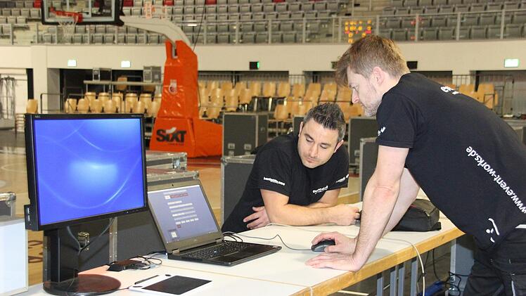 Rund fünf Stunden benötigen Kern, Assistent Ahmad Shabark und Florian Dotterweich, Geschäfts- und Projektleiter, sowie einige Helfer, bis sie ihre bis zu 100 Kisten ausgepackt und den Inhalt aufgebaut haben. Ein mittlerer sechstelliger Euro-Betrag an Wert, schätzt Dotterweich, steht dann in der Halle - ohne das Fernseh-Equipment. Die TV-Firma NEP-Broadcast kommt am Spieltag gegen Mittag und zieht ihre Ton- und Kamerakabel durch die Arena. Der Video-Würfel unter der Hallendecke ist fest installiert und wird von Eventworks lediglich "bespielt".