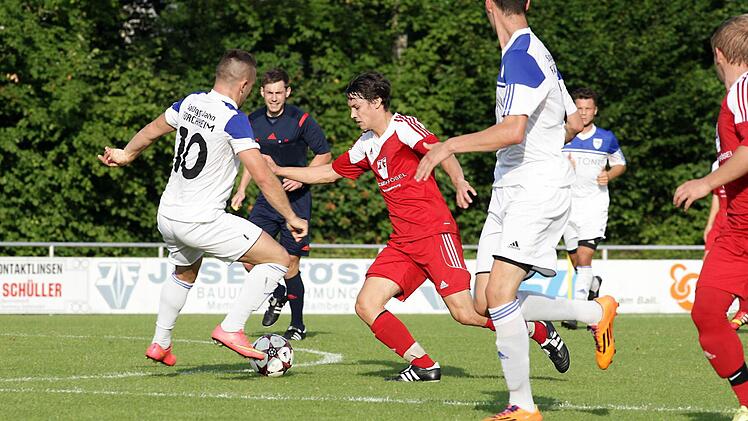 Einen munteren Anfang sahen die 250 Zuschauer. Die Gastgeber zeigten in der ersten Halbzeit wenig Respekt. Sie versteckten sich keinesfalls und stießen immer wieder mit schnellem Spiel nach vorne. Bereits in der 4. Minute startete Pflaum ein Solo, wurde aber in letzter Sekunde gebremst. Sechs Minute später folgte ein scharf geschossener Freistoß von Kamm. Bis zur 17. Min. hielten die Gastgeber gut mit und das Spiel offen.