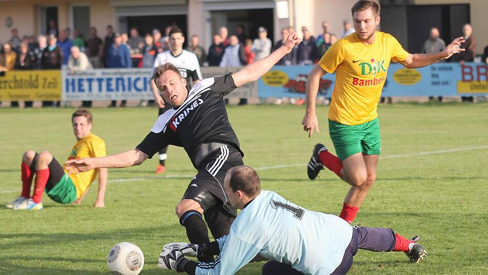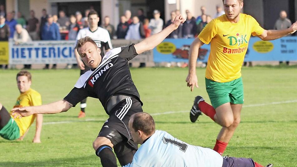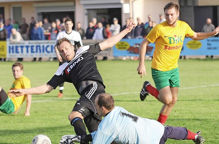 Nach dieser Anfangsphase nahmen die Gastgeber mehr und mehr Heft des Handelns in die eigene Hand. Allerdings neutralisierten sich beide gut aufeinander eingestellten Mannschaften weitgehend im Mittelfeld. In der 30. Min. ließ Thorsten Schlereth mit einem seiner typischen Antritte einige Bamberger stehen. Sein Pass fand jedoch keinen Abnehmer. Zwei Minuten später setzte sich Schlereth erneut in Szene und drang selbst in den Strafraum ein. Zwei DJKler schafften es nicht, ihn zu stören. Als Torwart Horcher ihn zu Fall brachte, entschied der insgesamt gute Schiedsrichter auf Strafstoß. Daniel Rinbergas nutzte diesen zum 1:0.