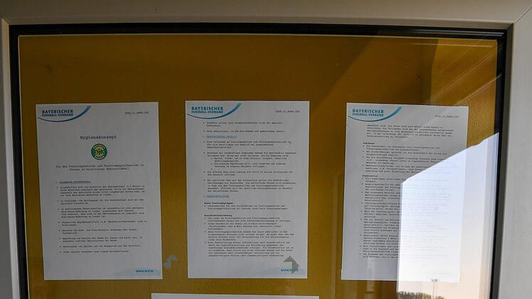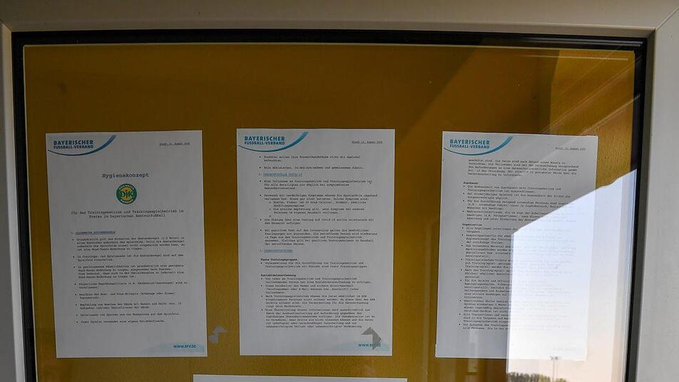 Kinder laufen in Sportklamotten und mit Masken auf den Gehwegen. Am Eingang steht ein Spender mit Desinfektionsmittel. Hinweisschilder hängen beinahe an jeder Ecke. An den Türen des Kabinentraktes ist auf neun Seiten das Hygienekonzept des Bayerischen Fußballverbandes (BFV) angebracht. Nur beim Blick auf die Fußballplätze sieht alles aus wie immer. Auf den vier Feldern der DJK Don Bosco Bamberg tummeln sich zahlreiche Spieler, die Trainer geben lautstark Anweisungen, Eltern verfolgen vom Spielfeldrand das Training ihrer Kinder. Doch abseits des Platzes ist alles anders als normal.