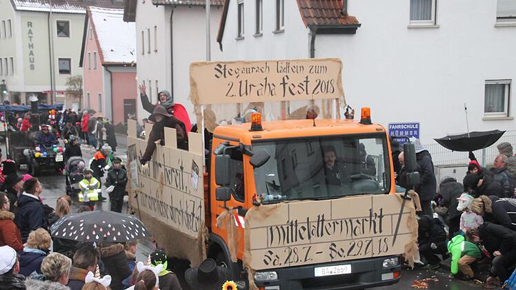 Mehrere Tausend Zuschauer säumten in Stegaurach am Sonntagnachmittag die Straßen vom Eingang des Sportgeländes der Spielvereinigung bis hinauf zum Altenburgblick und vor die Türen der Aurachtal-Sporthalle, um das bunte Treiben der Stegauracher Narren und ihrer Gäste aus Waizendorf, Walsdorf, Mühlendorf, Erlau oder Baunach mit Helau und Buna-Hu zu begleiten.