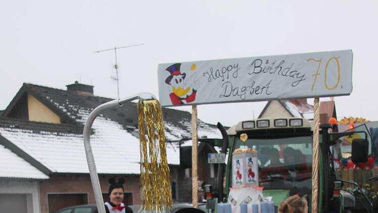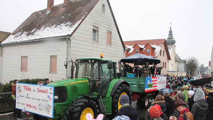 Unentschieden ging der Wettbewerb in diesem Jahr tatsächlich aus, denn die Dorfjugend Mühlendorf schoss mit ihrem "Vambier"-Transporter ebenso den Vogel ab wie die Reservisten von Unteraurach mit einer kunstvoll gestalteten Bergkulisse. Den dritten Platz belegte die Dorfgemeinschaft Erlau mit einem Dagobert Duck, der seinen siebzigsten Geburtstag mit einem millionenschweres Wannenbad beging. Gleichwohl, in Stegaurach weiß man so zu feiern, dass es nicht gleich schmerzlich ins Geld läuft. Und wenn doch, so helfen vielleicht die Walsdorfer aus. Sie boten mit ihrem Themenwagen eine nicht ganz ernstzunehmende Lösung für Gemeindekassen an, die gelegentlich oder öfter von einer Ebbe heimgesucht werden. Unter dem Motto "We make Stegaurach great again" erklärten sie, "Thilo ist Donald einen Schritt voraus und bringt einfach seine eigene Währung raus".