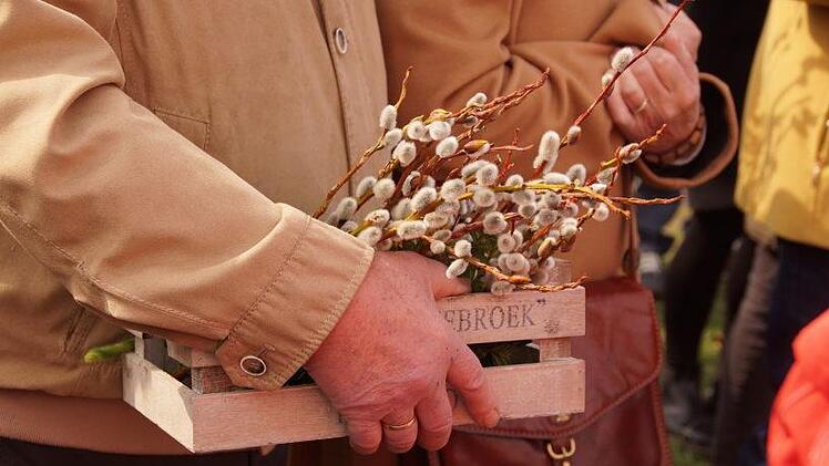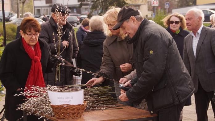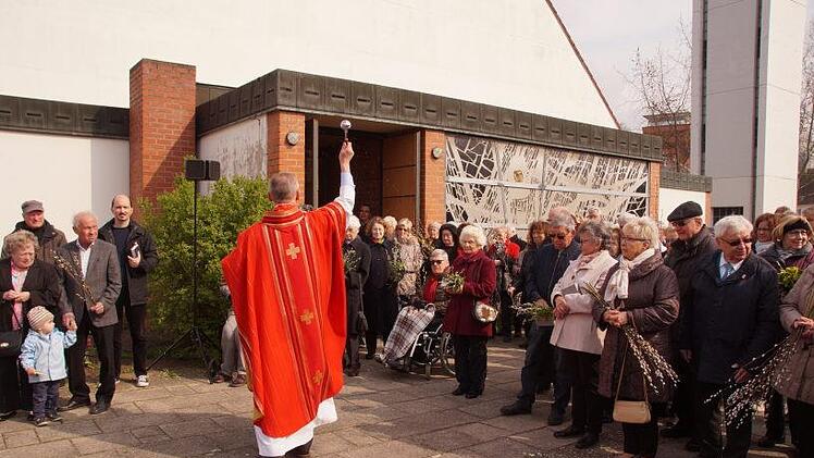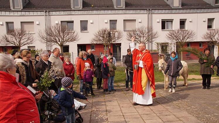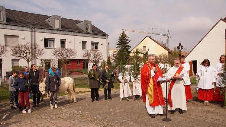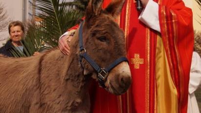 Auch dieses Jahr feierte der Salesianerpater Dieter Putzer den Palmsonntag in St. Wolfgang wieder mit Eseln. Kerstin Deuber hatte den Wallach "Steppke" und die Stute "Emma" vom Schneckenhof in der Südflur neben der Brose-Arena in die Stadt zu der Palmsonntagszeremonie geführt. Die Gläubigen hatten Palmkätzchensträuße mitgebracht oder konnten sich welche geben eine Spende von einem Tisch nehmen.