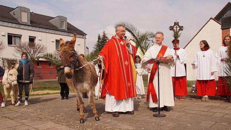 Pater Dieter Putzer brachte zum Palmsonntagsgottesdienst in St. Wolfgang zwei Esel mit.
