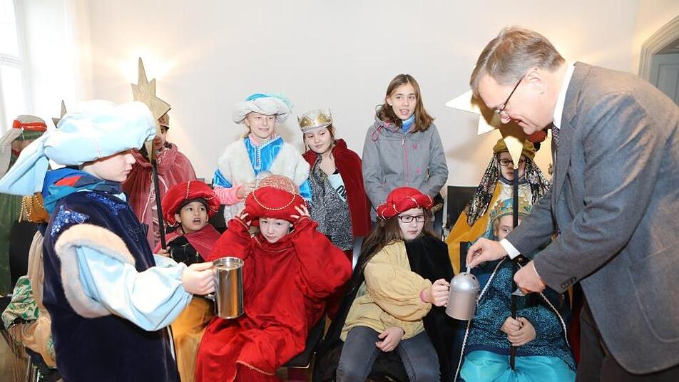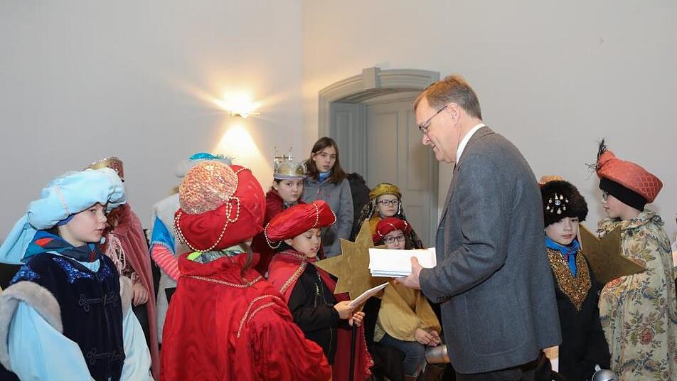 Der OB ist von den königlichen Herrschaften in ihren farbenfrohen Gewändern derart beeindruckt, dass er all die Kaspars, Balthasars, Melchiors und Sternenträger aus der Pfarrei St. Martin einzeln per Handschlag begrüßt: "Willkommen im Rathaus!" ruft Starke ihnen zu. Es sei eine "wunderbare Tradition", dass die Sternsinger das Rathaus besuchen, fügt er hinzu und schaut sich suchend nach den Sammelbüchsen um. Vier werden dem Stadtoberhaupt auch flugs entgegengestreckt.