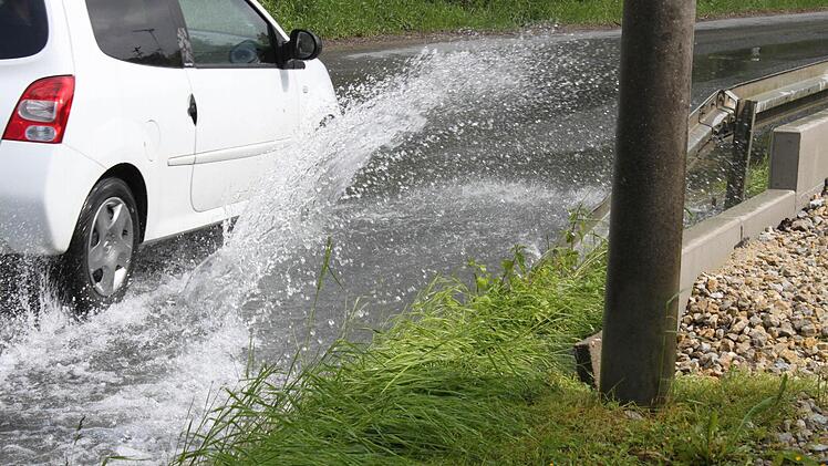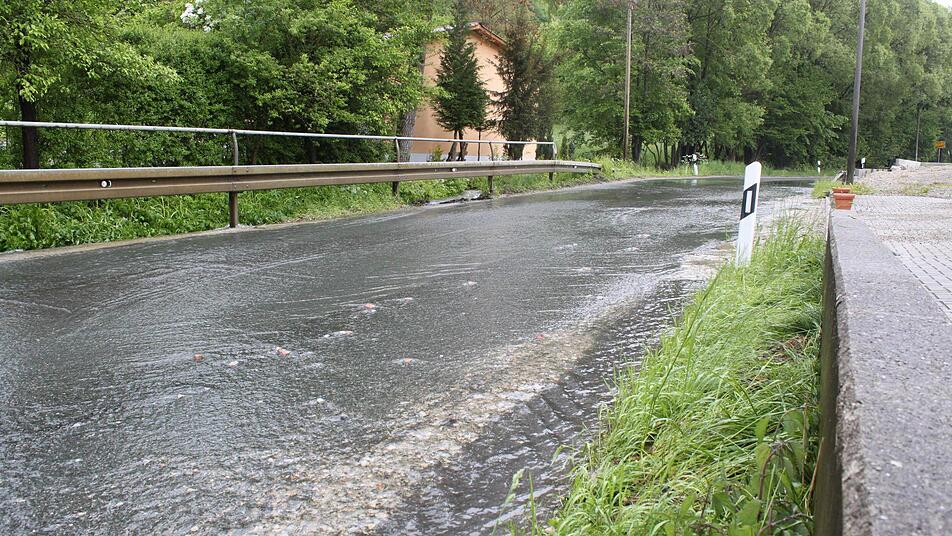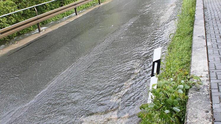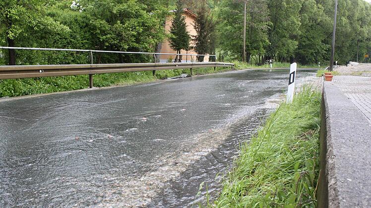 Auch zwei Tage nach dem großen Regen ist die Staatsstraße von Scheßlitz hinauf nach Wattendorf noch teilweise überflutet. Vor allem in Roßdach kommen den Autofahrern wahre Sturzbäche entgegen.