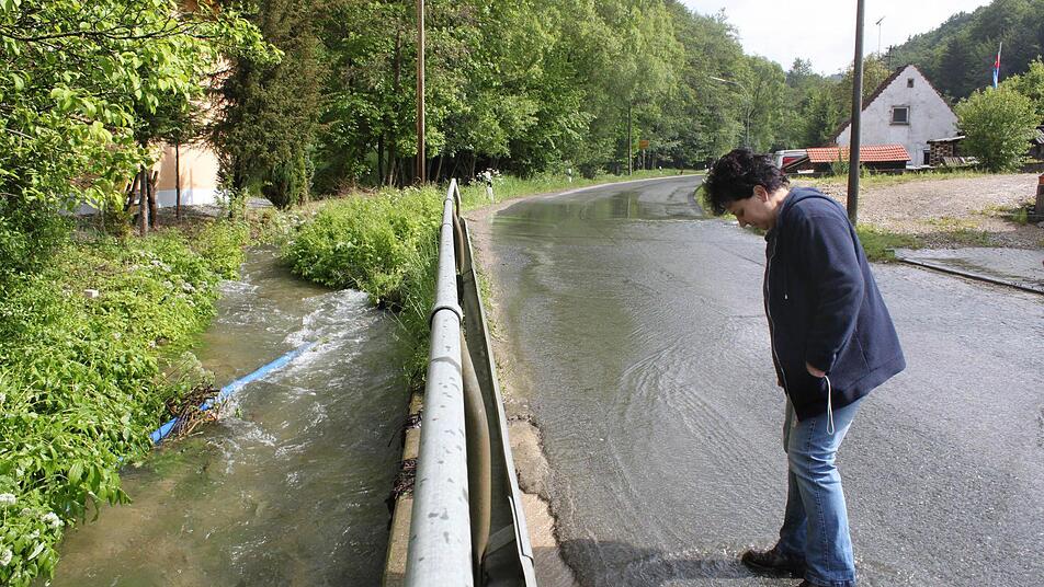 "Am Sonntag um Mitternacht war er draußen", berichtet Eva Schickentanz. Sie wohnt dort, wo der Ellenbach durch eine doppelte Verrohrung unter der Straße hindurch in den Leitenbach geleitet wird - normalerweise. Zwei, drei Mal im Jahr ist die Straße vor ihrem Haus nach starkem Regen oder während der Schneeschmelze überflutet, sagt Schickentanz. "Aber so schlimm wie diesmal war's noch nie!" Offenbar ist eines der beiden Durchlassrohre verstopft. Die Wassermassen, die noch den Berg herabkommen sind bis Dienstagmittag nicht weniger geworden, obwohl es nicht mehr regnet.
