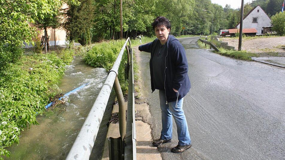 Eva Schickentanz fürchtet, dass bald auch ihre Hofzufahrt in Mitleidenschaft gezogen wird. Von der Straßenseite her sind die Pflastersteine schon teilweise freigespült. "Die roten Steine hat man vorher nicht gesehen", sagt Schickentanz und deutet auf den Grund des reißenden Baches, also auf die Staatsstraße.
